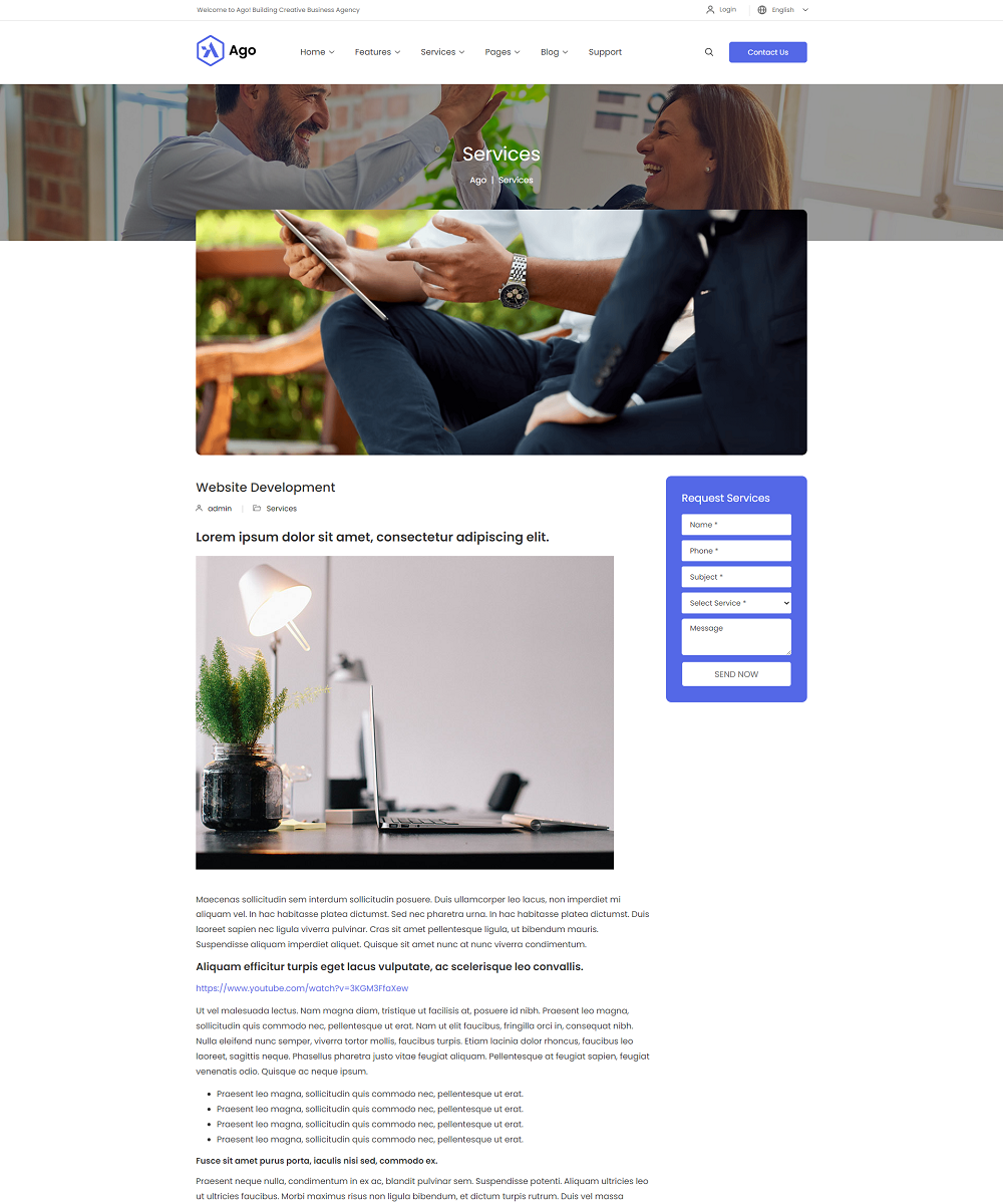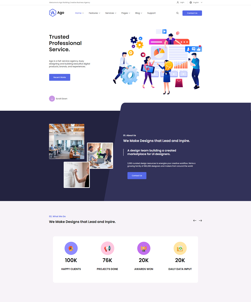 The homepage is a business website design with many useful content sections that are ready to utilize. Ago is completely customizable, so you can easily change the colors, background, fonts, and other elements. Ago is a fantastic responsive WordPress theme for business and agency websites.