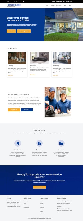 Home services is a feature-rich WordPress theme for local businesses like: construction, HVAC, repair and handyman, maintenance and renovation, plumbers and plumbing contractors, gardening and landscaping, electricians, carpenters, flooring and hardwood, painting and staining, cleaning and maid, and more.