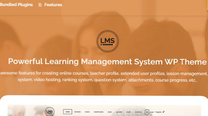This is a popular Online Learning Management System WordPress theme with over 5000 downloads. It integreates with the popular Woocommerce and S2Member plugins. Woocommerce facilitate the commerce features while the S2Member plugin provides the membership features.